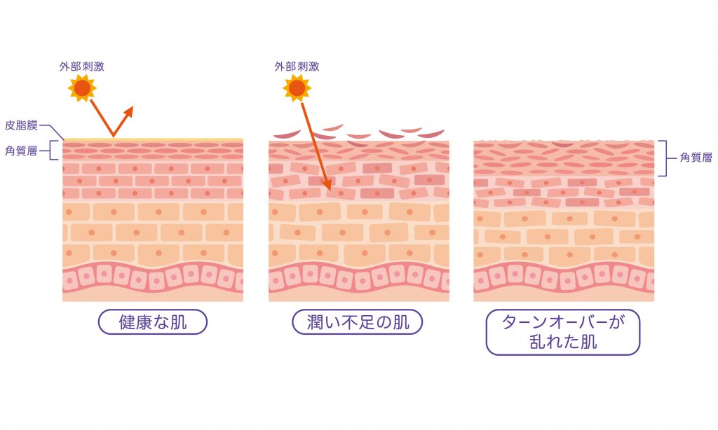 ターンオーバーが早くなりすぎると、肌表面に未成熟な細胞が露出。そのため水分を充分に保てなかったり、些細な外的刺激が大きなダメージになったりして、肌が荒れてしまうのです。